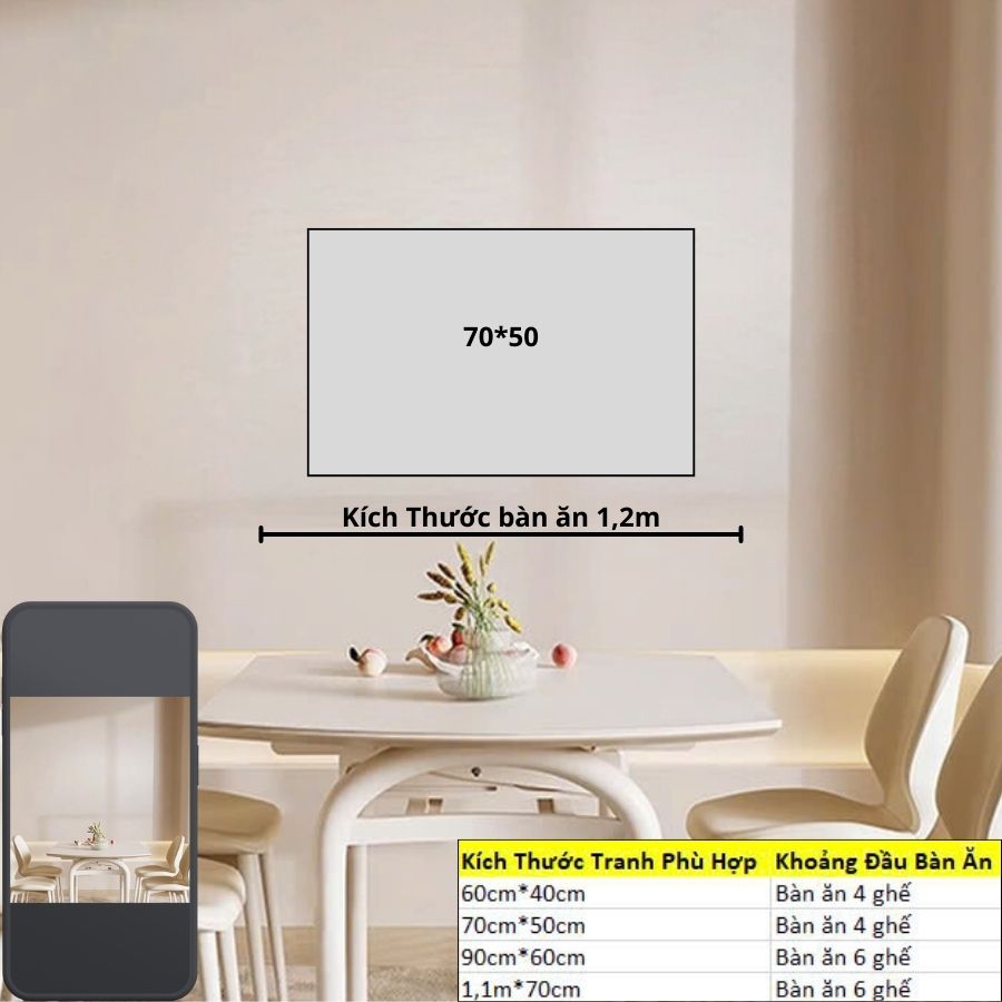 Bức tranh treo phòng ăn không chỉ làm đẹp không gian, mà còn là yếu tố gắn kết cảm xúc gia đình, tạo bầu không khí ấm cúng và thoải mái. Các tác phẩm nghệ thuật dành cho phòng ăn thường mang hình ảnh tươi sáng, hài hòa với không gian, khơi gợi cảm giác ngon miệng và niềm vui trong mỗi bữa ăn.