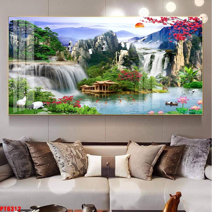 Những dãy núi trùng trùng điệp điệp đội trên mình dải mây trắng xóa, ánh mặt trời đỏ rực nhuộm màu rừng cây xanh ngắt, những thác nước đổ òa xuống như một dải lụa hòa cùng tiếng chim muông ồn ã. Tất cả tạo nên bức tranh Sơn thủy hữu tình kì vĩ, đẹp đến nao lòng. Là bức tranh treo tường phong cảnh thiên nhiên nhưng lại hữu tình và đầy thi vị.