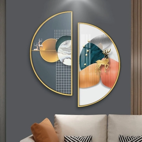 Tranh bán nguyệt hươu vàng trừu tượng với gam màu sáng loáng , bóng bẩy của vàng kim và xanh ngọc mang đến cho không gian căn phòng một điểm nhấn riêng biệt và có ý nghĩa phong thủy tài lộc, may mắn.