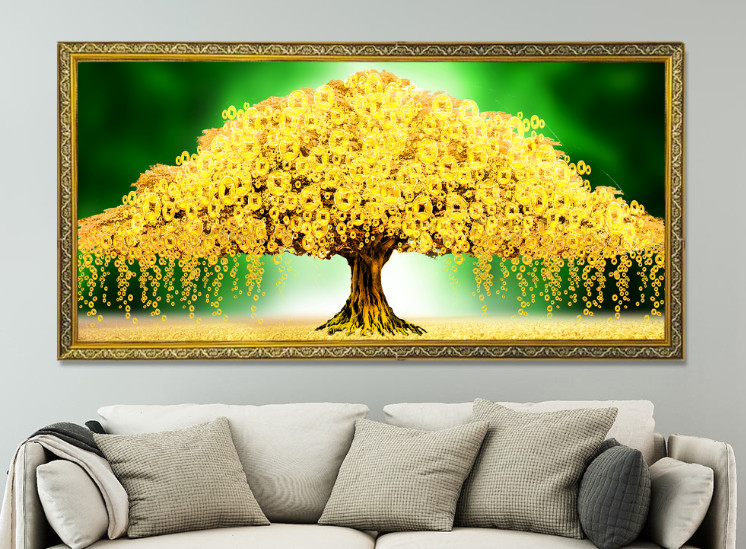 Bức tranh với hình ảnh cây tiền có nhiều đồng tiền vàng vô cùng đẹp mắt và thảm cỏ bên dưới cây cũng màu vàng . Gam màu vàng tượng trưng cho đời sống Hoàng Gia. Treo bức tranh Cây đồng tiền vàng trong nhà sẽ mang lại nhiều tài lộc, khiến công việc làm ăn của gia chủ gặp thời, phất lên nhanh chóng....
