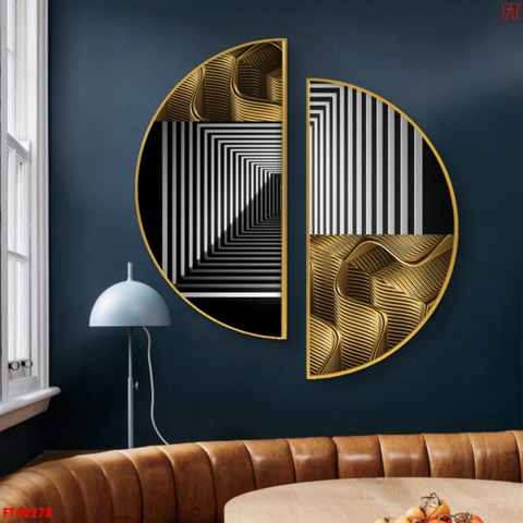 Tranh bán nguyệt trừu tượng với gam màu sáng loáng , bóng bẩy của vàng kim và xanh ngọc mang đến cho không gian căn phòng một điểm nhấn riêng biệt và có ý nghĩa phong thủy tài lộc, may mắn