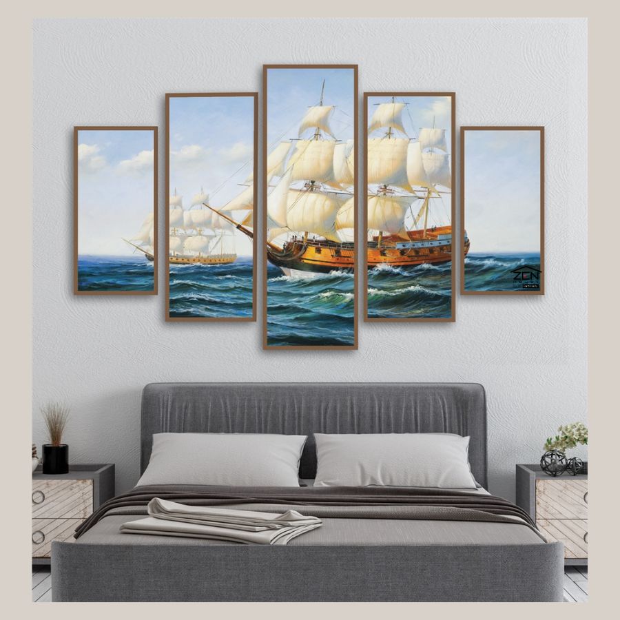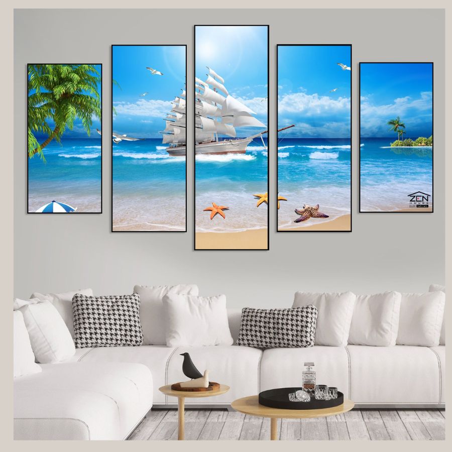 Bức tranh tráng gương "Thuyền Buồm" tại Zen House tượng trưng cho sự mạnh mẽ, thành công và khát khao chinh phục biển lớn. Hình ảnh con thuyền căng buồm ra khơi giữa đại dương bao la là biểu tượng của sự tiến bước, vượt qua thử thách để đạt đến mục tiêu và thành công.
