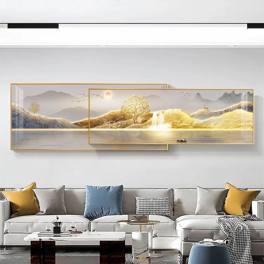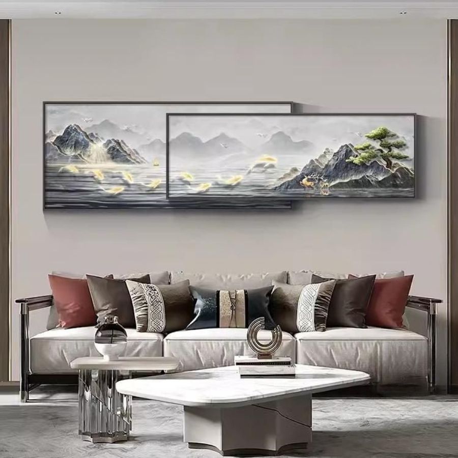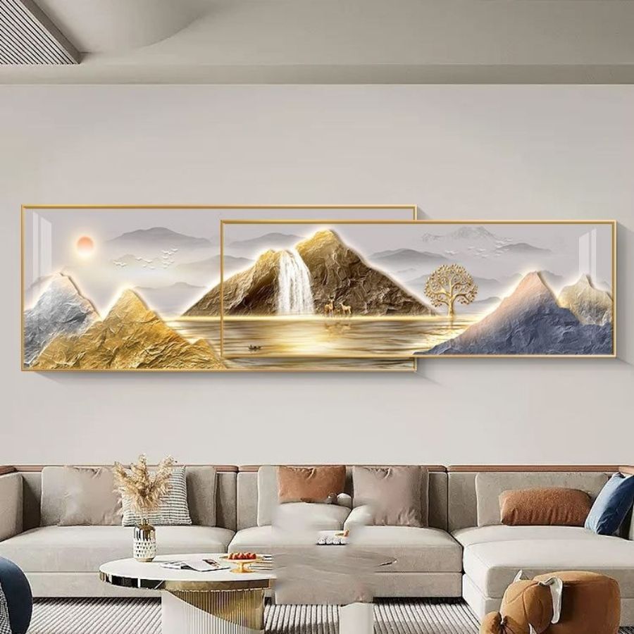 Núi trong phong thủy tượng trưng cho điểm tựa vững chắc, mang lại sự ổn định và bình an cho gia chủ. Đặc biệt, với bề mặt gương phản chiếu, bức tranh như mở rộng không gian, tạo cảm giác thoáng đãng, sáng sủa và tràn đầy năng lượng tích cực.