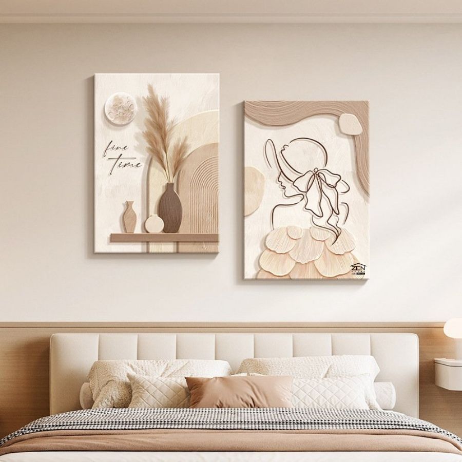Chủ đề tranh phòng ngủ thường mang hơi thở nhẹ nhàng, lãng mạn, giúp người xem dễ dàng cảm nhận được sự thư thái và bình yên, tạo ra không gian lý tưởng để thư giãn sau những giờ làm việc căng thẳng. Đó có thể là hình ảnh hoa lá mềm mại hay cảnh thiên nhiên tĩnh lặng, mang lại sự cân bằng trong tâm hồn.