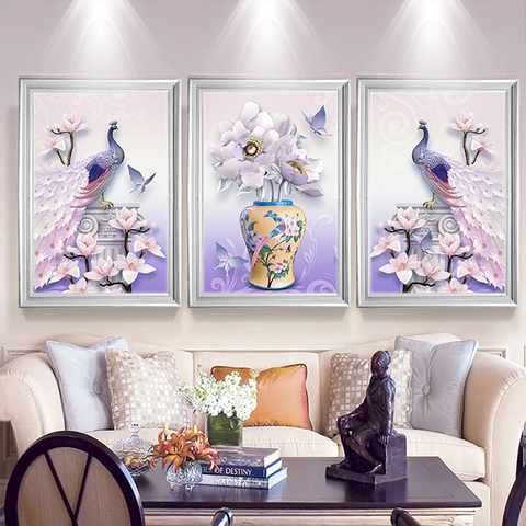 Tranh treo tường đôi chim công và bình hoa sứ mang tính biểu trưng cho phú quý, cát tường cùng với mong muốn cuộc sống hôn nhân hạnh phúc