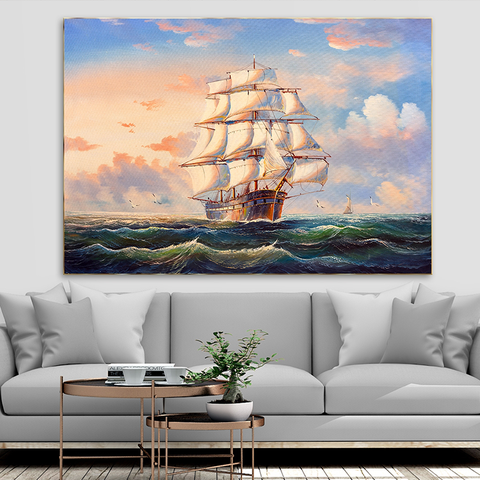 Con thuyền hẳn không còn xa lạ gì với mọi người trong câu nói “thuận buồm xuôi gió”. Ngày xưa, dân ta sống chủ yếu bằng nghề chài lưới, lênh đênh trên mặt biển cả tháng trời. Những công sức khổ cực như vậy thường hay bị công cốc bởi những cơn bão, sóng to gió lớn,.. Bức tranh canvas con thuyền như một lời chúc ngư dân bình an mạnh khỏe, gặp thời tiết thuận lợi và thu hoạch được nhiều tôm cá.